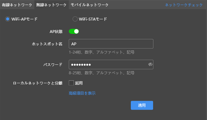 • 「AP状態」:端末のWiFi APをオン・オフにします。