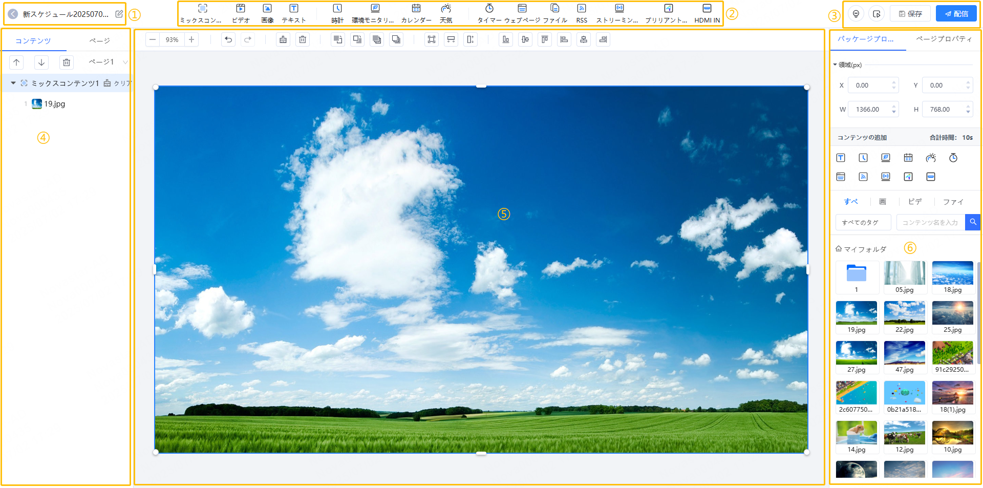 ページのスケーリングやコンテンツの削除、コンテンツの階層・レイアウトの調整に使われ、ロット操作に対応します。空白部分をダブルクリックしてテキストコンポーネントを追加できます。